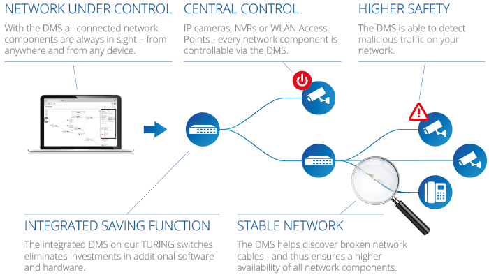 TURING switch in, IT budget down: Thanks to the integrated Device Management System (DMS) , LevelOne's TURING switches ensure significant cost savings . Because IT departments can do without the purchase of an extra management software or server.
