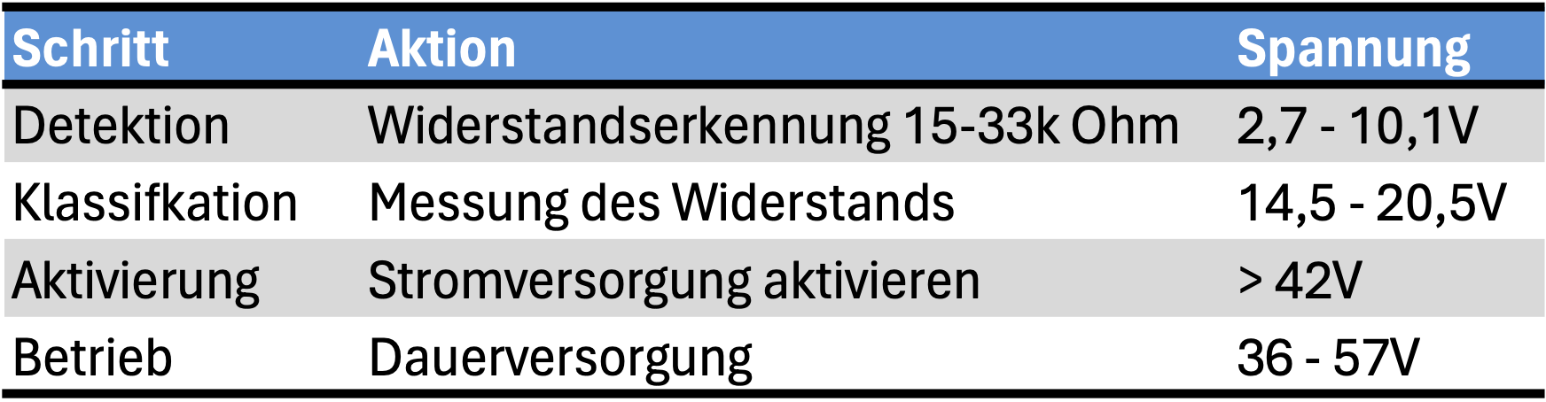 Damit PoE-Endgeräte funktionieren können, muss der elektrische Strom gemeinsam mit den Daten durch das Ethernet Kabel transportiert werden. Dies ist bei Ethernet Daten möglich, da der von PoE genutzte Gleichstrom keine Wechselwirkung mit den Datensignalen aufweist. Der Strom wird dabei durch das Power Sourcing Equipment (PSE) in das Kabel injiziert. Daher auch der Name PoE-Injektor für PoE PSE Stromversorgungskomponenten, wie zum Beispiel unser POI-3000. Hierbei unterstützen solche PSE sowohl die herkömmliche Speisung über ungenutzte Datenleitungen als auch die so genannte Phantom-Speisung bei Gigabit Ethernet, bei der Daten und Strom auf den gleichen Adern transportiert werden. Ist das Endgerät PoE-kompatibel, ein so genanntes Powered Device (PD), so sind bereits alle Voraussetzungen für den Einsatz erfüllt. Wird nun ein Nicht-PoE Gerät angeschlossen, so wird dank der Detektion kein Strom an das Endgerät geliefert, um eine mögliche Beschädigung zu verhindern. Diese Erkennung läuft in 4 Schritten ab, wie in nebenstehender Tabelle abzulesen.
